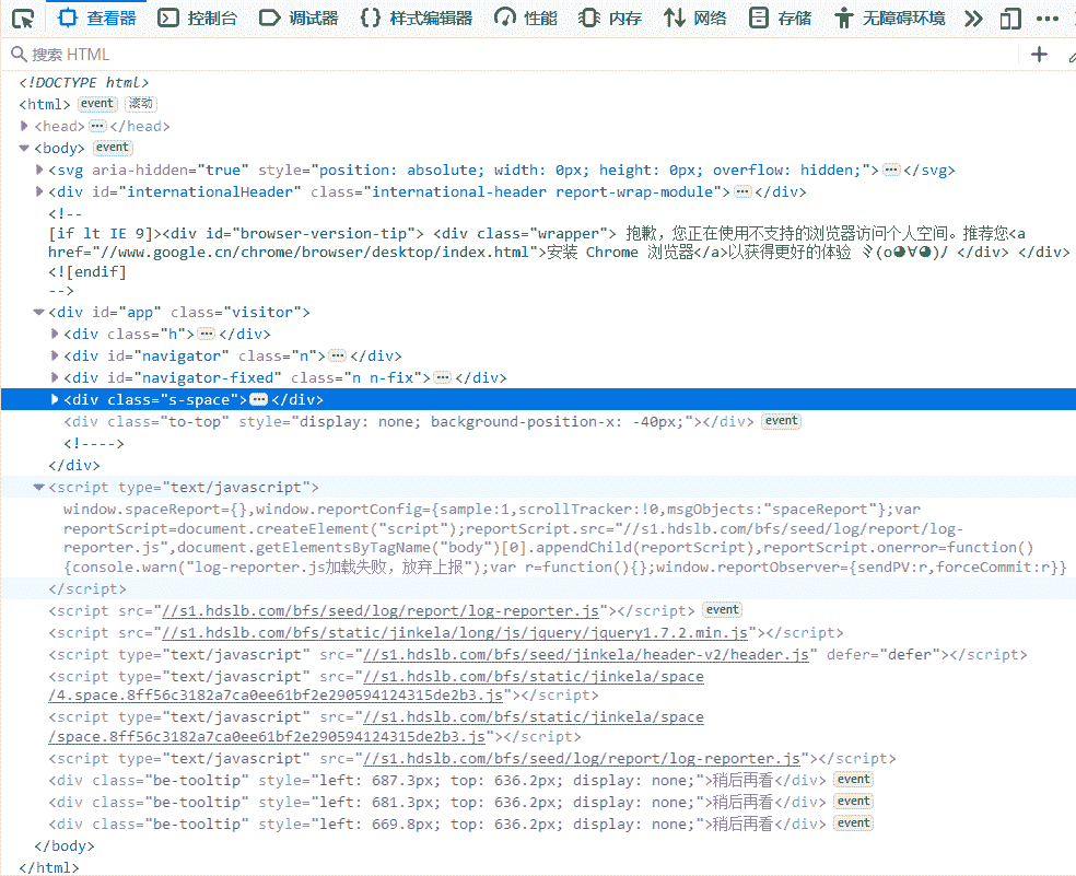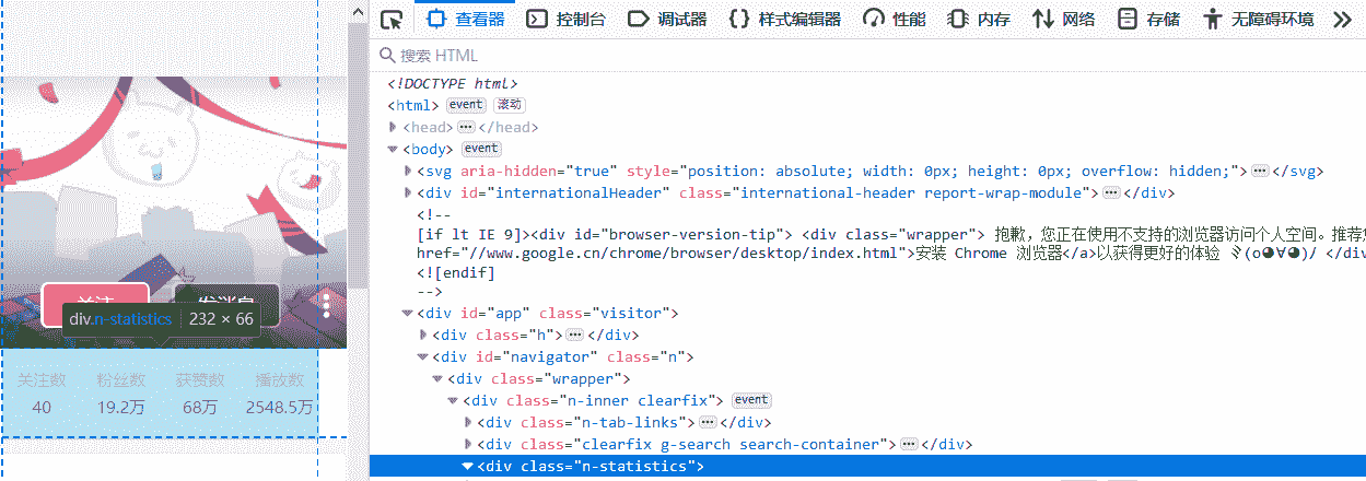 从图 F2-1 中可以看到,浏览器载入了很多的内容,图中高亮的部分(class="s-space")就是 B 站上某播主的主页空间的内容。接下来使用第 5 章中的代码抓取该播主的部分统计信息(class="n-statistics"),见图 F2-2。