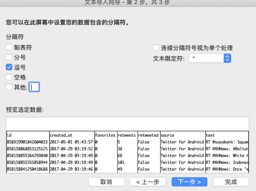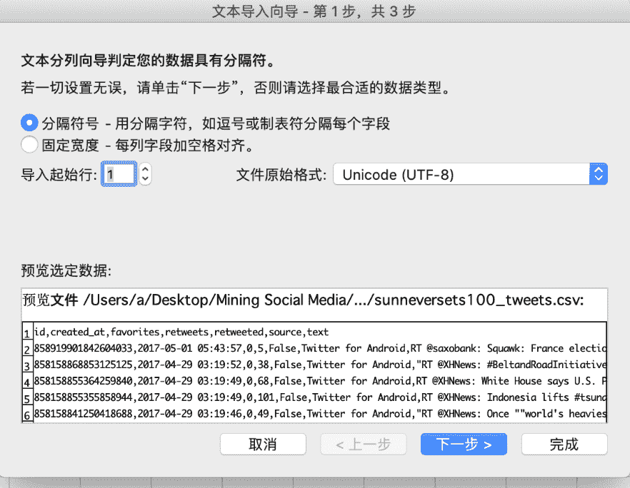 在弹出窗口中选中文件 sunneversets100_tweets.csv 并打开,此时就会跳出一个"文本导入向导"的窗口(图 F3-2)。在该窗口中选中"分隔符号"并在"文件原始格式"中选中 UTF-8,然后点击"下一步"按钮。