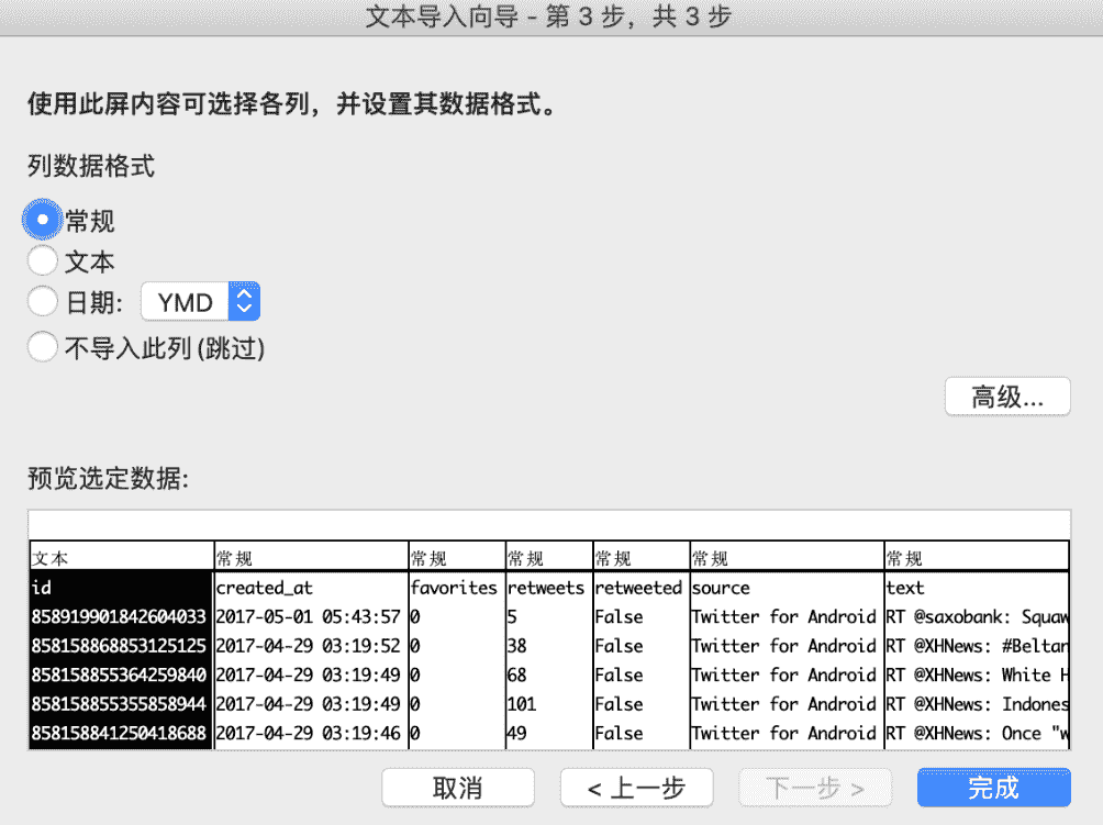 在文本导入步骤的最后一步,可以简单的对每一列的数据类型进行设置(图 F3-4)。在这个步骤中把"id"数据列设置成"文本"类型,其余的保持"常规",最后点击"完成"按钮并在另一个弹出框中点击"确定"完成文本导入步骤。如果读者想要在另一个工作表中保存导入的数据,则在弹出框中选择"新工作表"并"确定"即可。