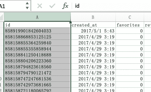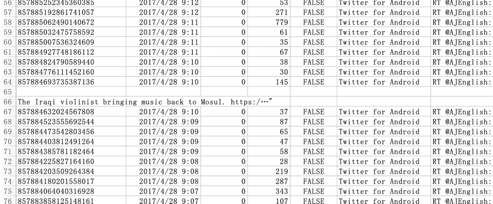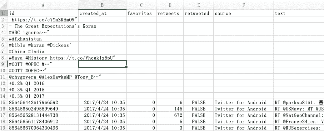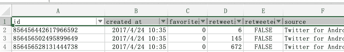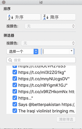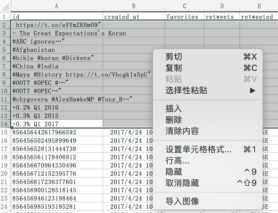 读者可能会想看上去无用的数据是哪里来的呢?经过检查 csv 文件中的数据,发现这些对于我们现在无用的数据是一些推文的主题,可以直接删除。然后,使用单元格的"筛选"功能逐一查看其他数据列中是否存在不相关的数据,如有则删除整行数据。