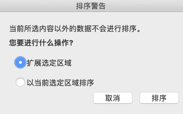 在图 F3-9 的两个选项中:"扩展选定区域"是保证每行数据不会发生错位;"以当前选定区域排序"会不考虑同一行中的其他数据,只会把选定的数据列进行排序,其他列中的数据保持原样,这样就打乱了数据中每一行的关联,所以一般不会使用这个选项。