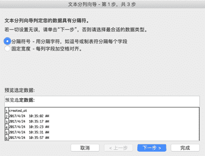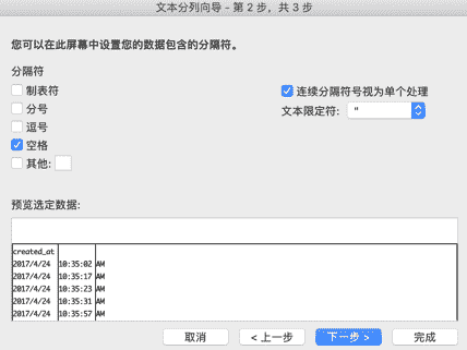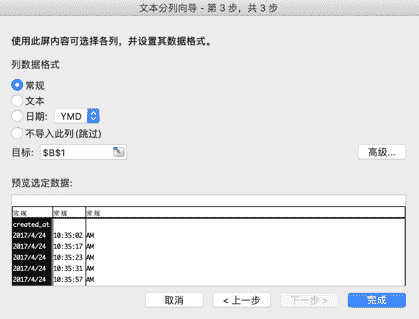 当点击完成后会弹出一个警告窗口,里面提示会有数据被覆盖(此时,点击窗口中的"取消"按钮)。重新检查图 F3-14 的最后一步发现"created_at"列被分隔成为 3 列,而不是预想中的两列。所以需要在"created_at"列后添加两个空白列后在进行上述的分列操作,其结果如图 F3-15 所示。