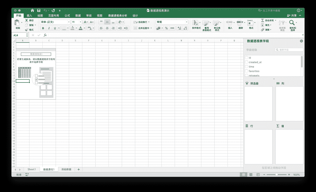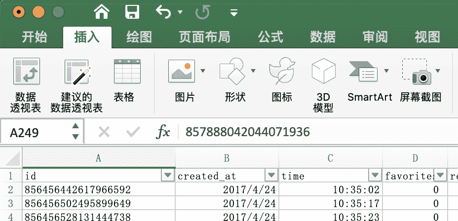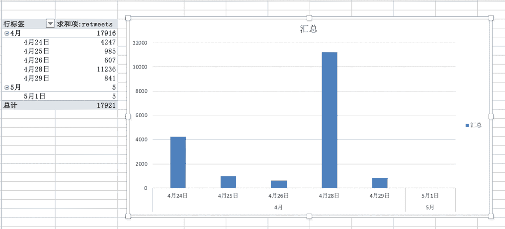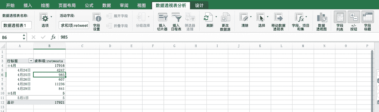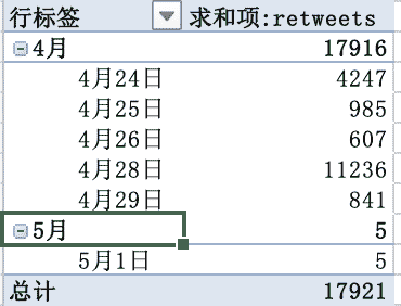 在右侧的"数据透视表字段"中显示了哪些数据可应用于该数据透视表中。通过用鼠标把这些字段拖入"行"、"列"以及"值"中就可以对数据进行汇总。现在,把"created_at"拖入"行"中并把"retweets"拖入"值"中,就会显示如图 F3-20 所示的表格。