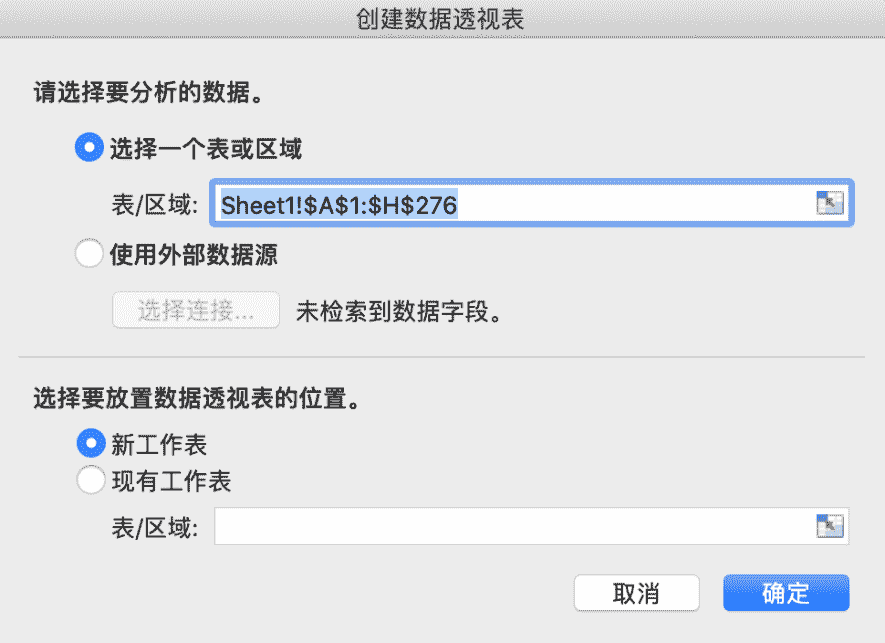 选中包含数据的任何一个单元格,然后依次点击"插入"菜单▸"数据透视表"图标(图 F3-17),之后就会弹出"创建数据透视表"窗口(图 F3-18)。