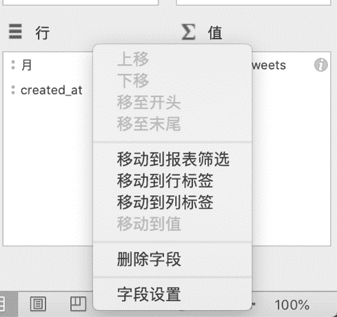 从上图中可以看到"行"中的"created_at"被显示为按照月份以及日期自动排序(这就是按照表 F3-1 设置数据类别的好处),"retweets"的前面多三个字"求和项",这三个表明"retweets"中的数据被按照日期计算每天的"retweets"(即:转发)量。通过鼠标右击"值"中的字段并点击"字段设置"(图 F3-21)来更改是"求和"还是"计数"等