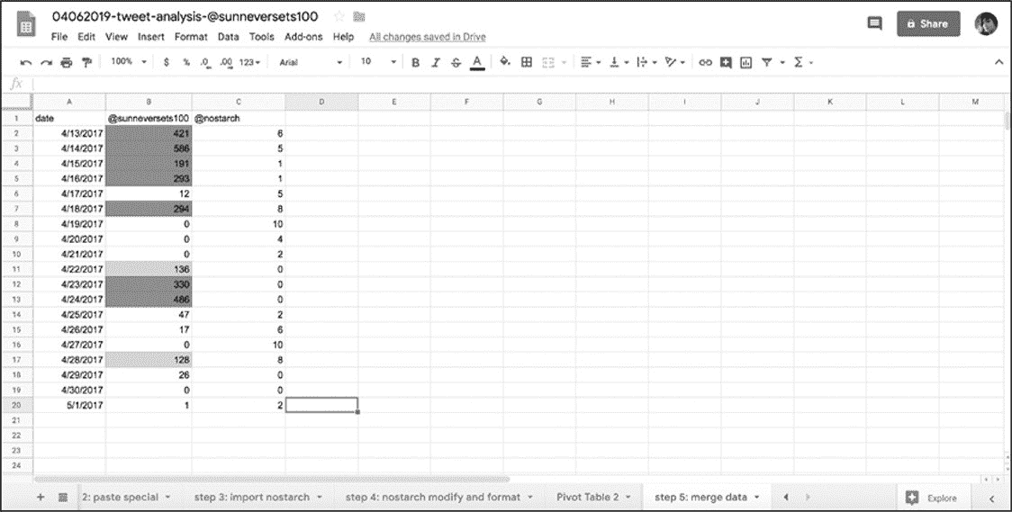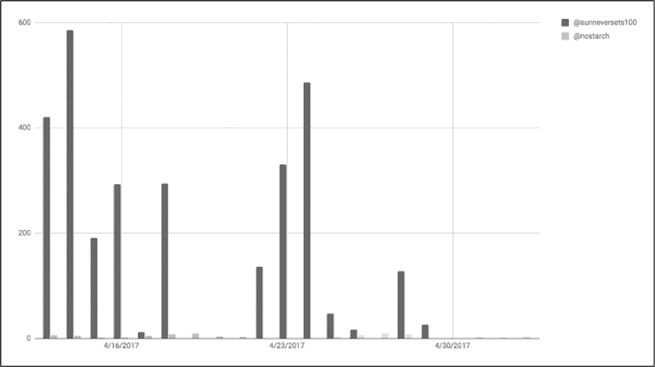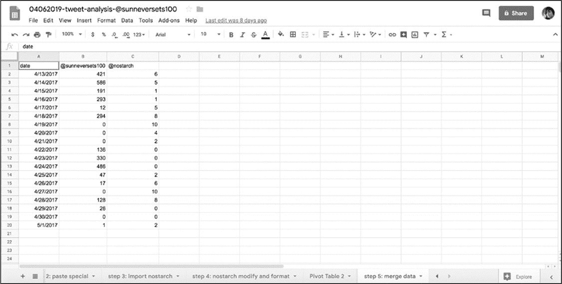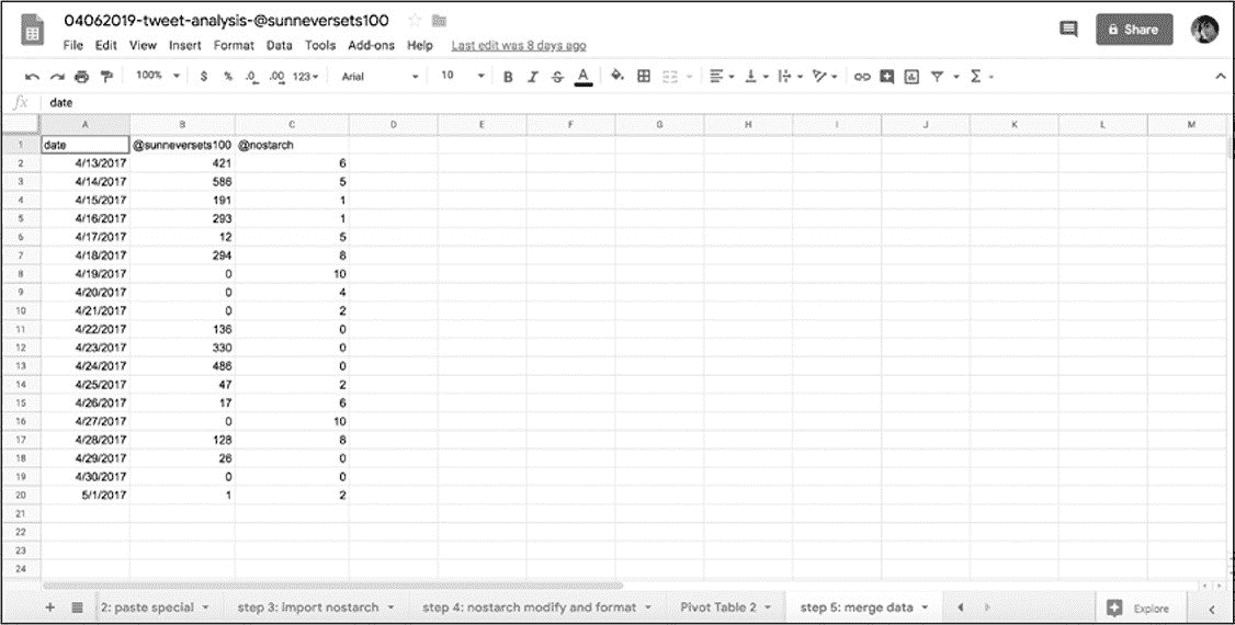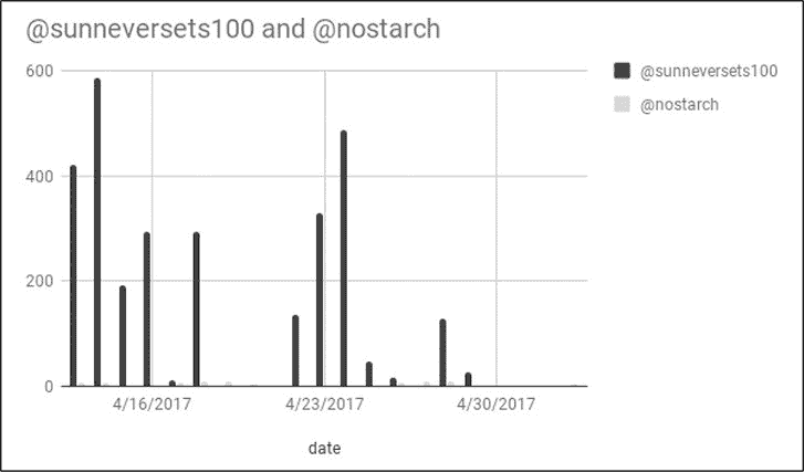 在前一章中,使用数据透视表记录了\@sunneversets100 和\@nostarch 的每日推文,从而为图表创建了一个时间序列。然后,根据两个数据集共有的时间范围使之合并。这就可以把两个账户放在一起并排对比了。