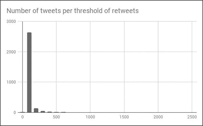 例如,在\@sunneversets100 数据中可以查看每个推文被转发的分布情况。在图 6-3 所示的原始数据表格中,能够看到推文被转发数值的范围从 0 到 1-100、101-200、201-300。