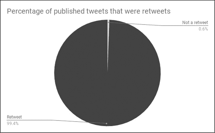 机器人经常被用来放大别人的信息,也就说明机器人不会发布太多原创内容。介于这个原因查看\@sunneversets100 账户的推文被转发的比例就会感到很有趣。图 7-5 的饼图展示了\@sunneversets100 账户的推文中有 99.4%被转发。