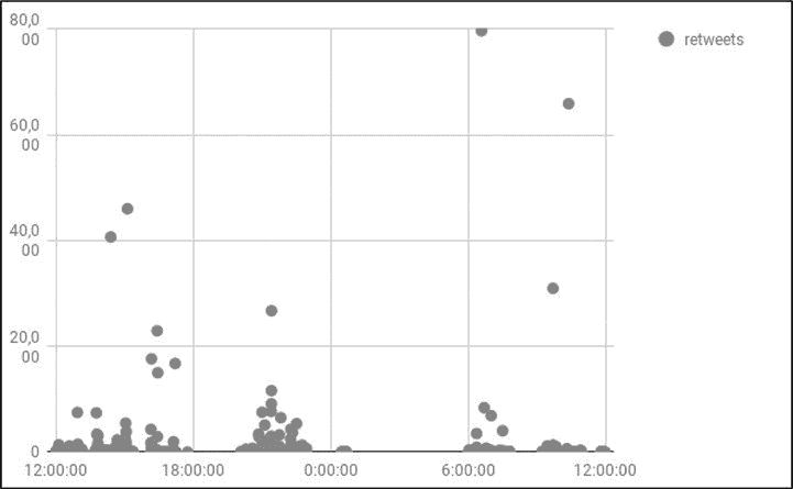 通常,研究人员感兴趣的是测量一个因变量或数据集如何受到一个无法控制的自变量或数据集的影响(比如降雨),这些因变量或数据集可能会由于外部因素而改变(雨伞的销售情况)。在某项研究中,研究人员想要找出降雨对雨伞销量的影响时,就可以使用散点图来观察两者之间的关系。散点图的惯例:自变量放在 x 轴上,因变量放在 y 轴上。同样的,给 Tweet 的推文数据提出如下问题:一天各个时间断对一条推文被转发的次数的有何影响?图 7-6 展示了一个图表,该图表给出了此问题的数据呈现。