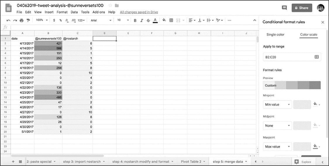 虽然色阶格式不像单色格式那样精确,但它是一种非常有用的可视化工具。色阶格式用于比较数据集的值。单色格式可以设置特定的阈值。之前例子中的问题是哪些日期揭示了\@sunneversets100 账户是一个机器人账户,该问题需要一个正确或错误的答案:在任何一天,机器人是否发出 144 次或更多的推文?相比之下,色阶格式更多带有一种探索性目的:不太清楚阈值是多少,也不知道如何限定一个值,但是想了解手上数据的范围和分布。