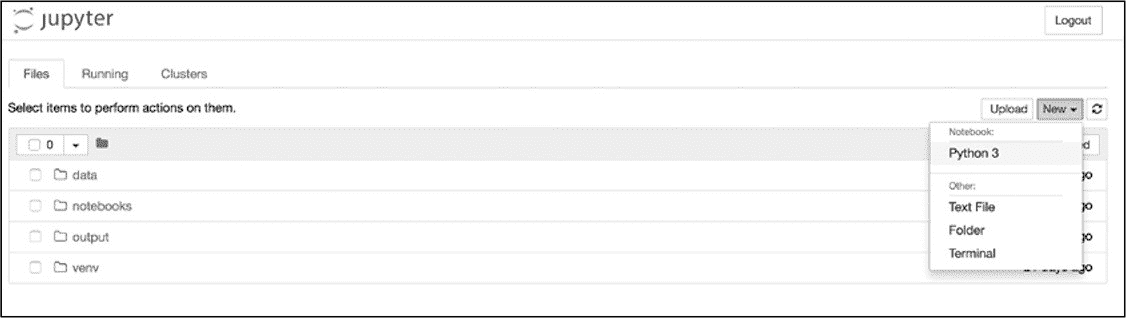 在这个界面里可以切换至工作文件夹并在其中创建文件。切换至 notebooks 文件夹中,从下拉菜单中选择"New ▸ Python3"。完成后就会在 notebooks 文件夹中创建一个新的 notebook 文件,并在一个新的浏览器选项卡中打开该 notebook 文件。