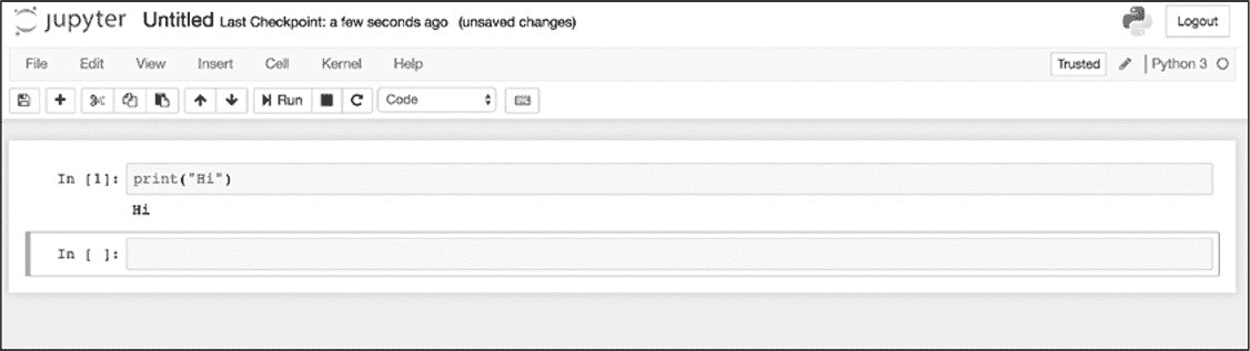用鼠标选中包含此代码的单元,然后按"Run"按钮(或使用快捷键 SHIFT-ENTER)来执行刚在单元中键入的 Python 代码。然后计算机应在单元格正下方打印出代码结果,同时创建第二个单元,如图 8-2 所示。
