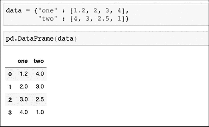 4]),"two"被赋予另一个 list([4,3,2.5,-1])。此处为了便于阅读,两个字典项中添加了换行符,但其不会影响代码的运行。运行此单元后的输出图 8-3 所示。