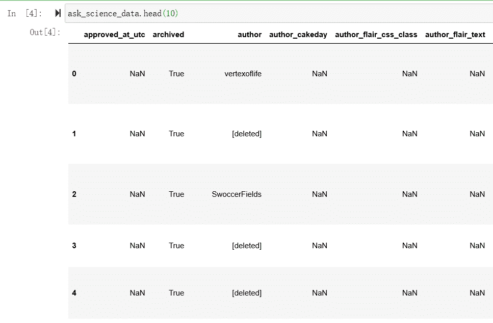 执行这个命令时,首先调用 ask_science_data 变量,该变量保存通过 csv 文件读取的数据。然后对变量包含的数据调用 head()函数,在 Jupyter Notebook 中的输出应如图 8-4 所示的数据框。如果想要查看数据集最后 10 行,可以使用 ask_science_data.tail(10)代码,其输出与图 8-4 中类似。